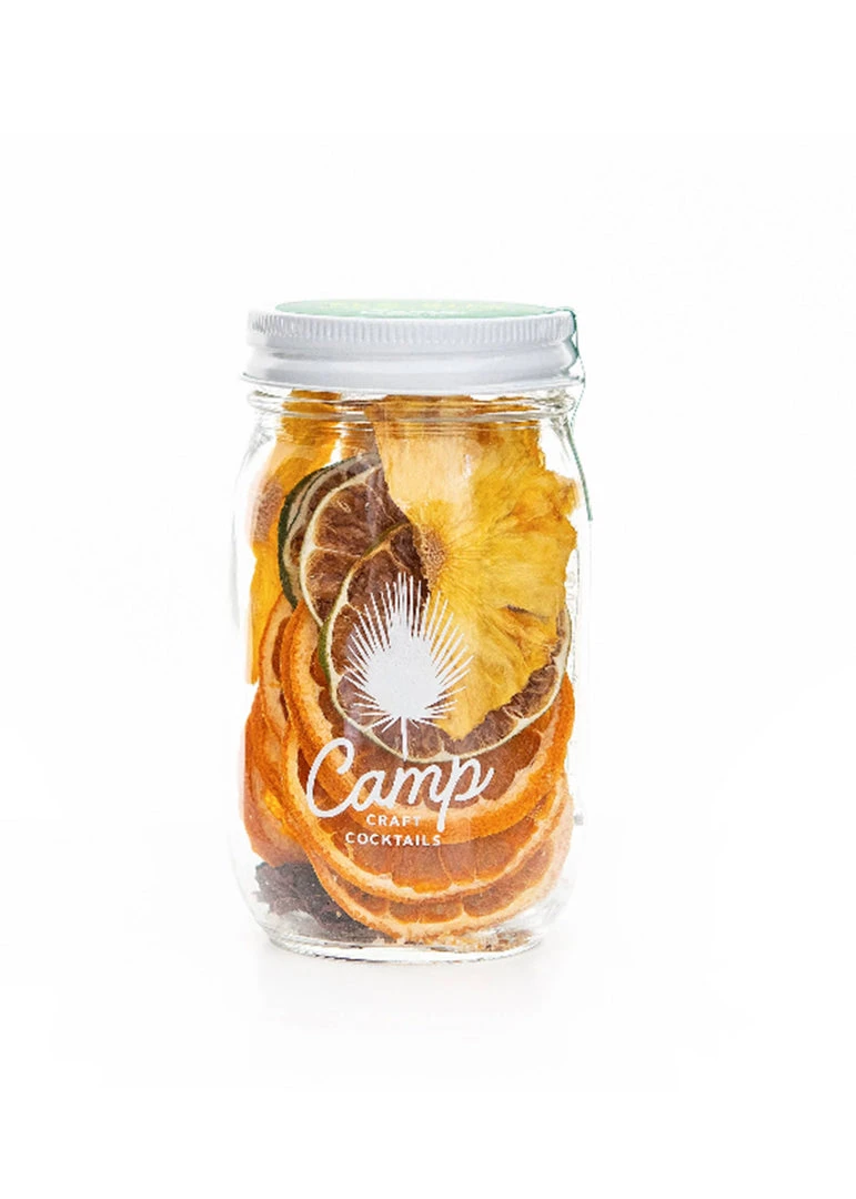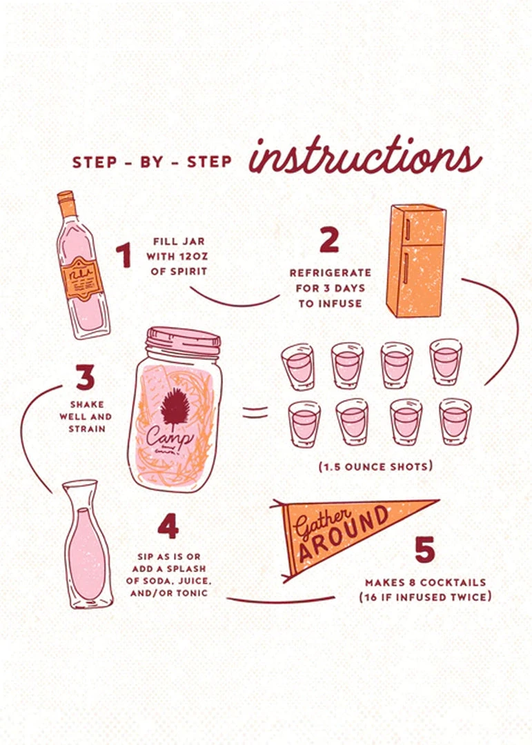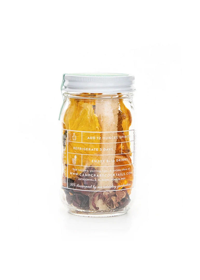 Each Camp Craft Cocktails Base Camp Kit includes: one infusion ready jar, custom ingredients, and are ready to go. Alcohol is not included. These Base Camp Kits serve 8, and can be infused twice for a total of 16 servings!