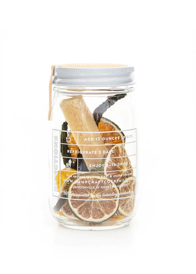 Each Camp Craft Cocktails Base Camp Kit includes: one infusion ready jar, custom ingredients, and are ready to go. Alcohol is not included. These Base Camp Kits serve 8, and can be infused twice for a total of 16 servings!