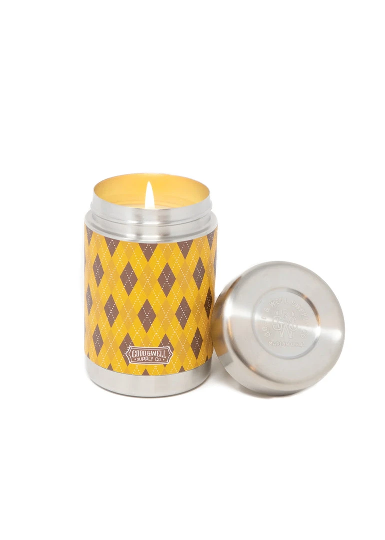 Decked out in classic gold and brown argyle, the Early Morning Hike soy candle blends bright notes of sweet orange and citrus with warm notes of clove and spice. Natural soy candle housed in a reusable 12oz stainless steel vacuum insulated flask with cotton wick.Â
