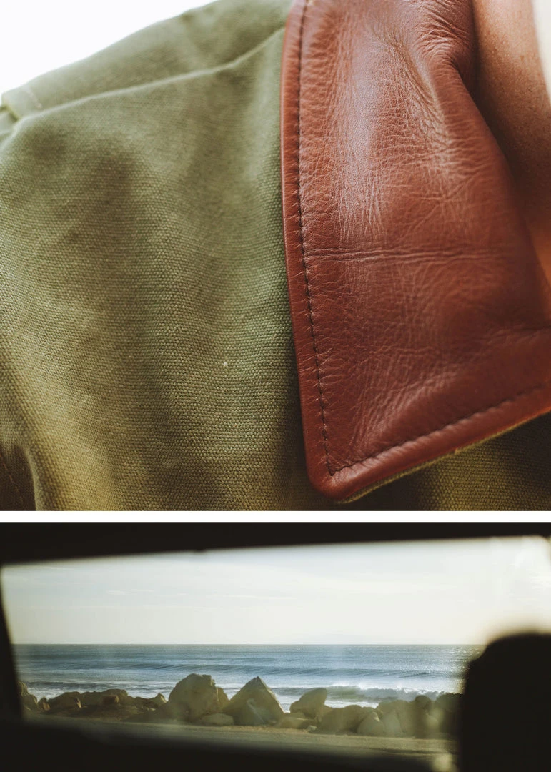 - Exterior: 14.75oz waxed cotton canvas + veg-tan leather collar