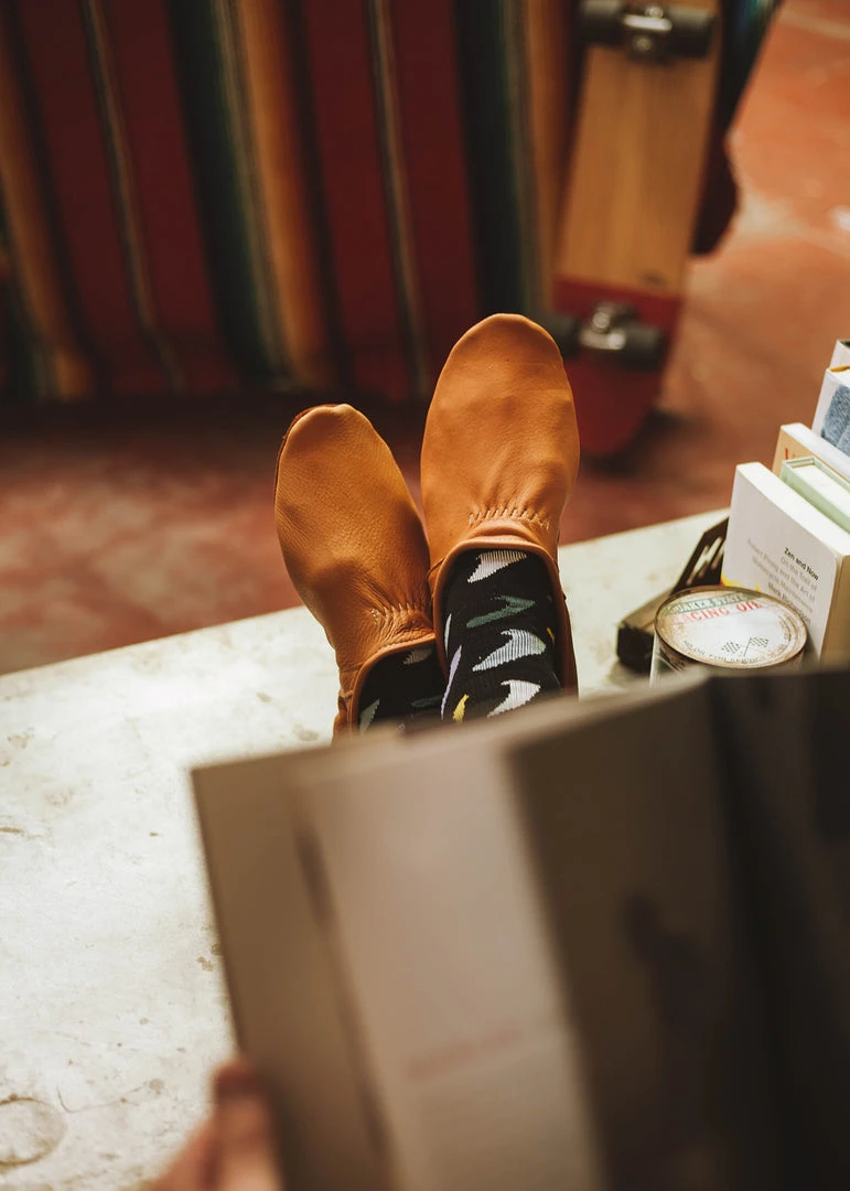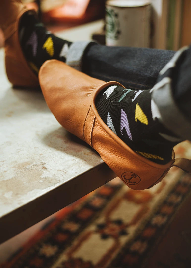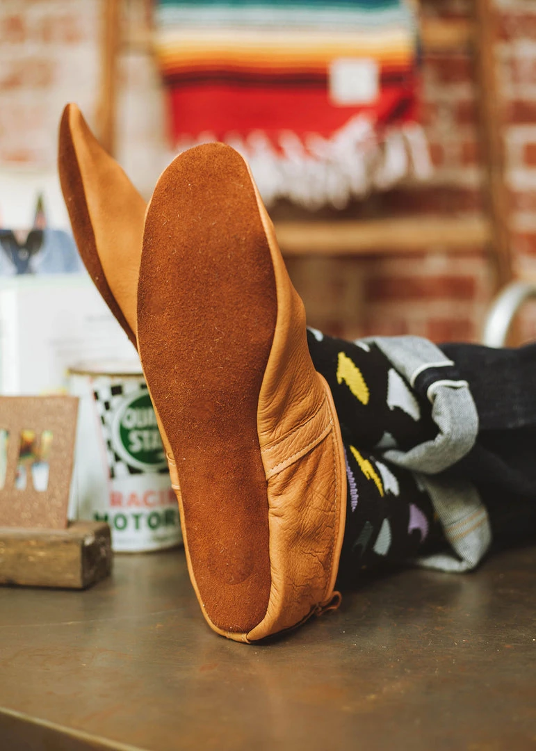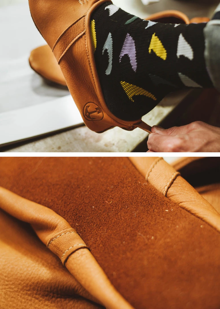 If you’ve ever heard stories from your grandfather about wearing deerskin moccasins around the family cabin in the dead of winter, well he wasn’t joking. They have to be one of the most comfortable pair of slips we have ever put on. In collaboration with Sullivan Gloves out of Bend, OR, these were literally hand cut, and hand sewn, per each size that we ordered. Made from a 2.5 – 3oz American deerskin for that luxurious soft feeling, with an insole made of memory foam, these are the bee’s knees.