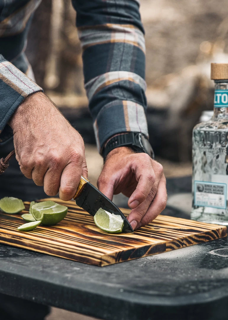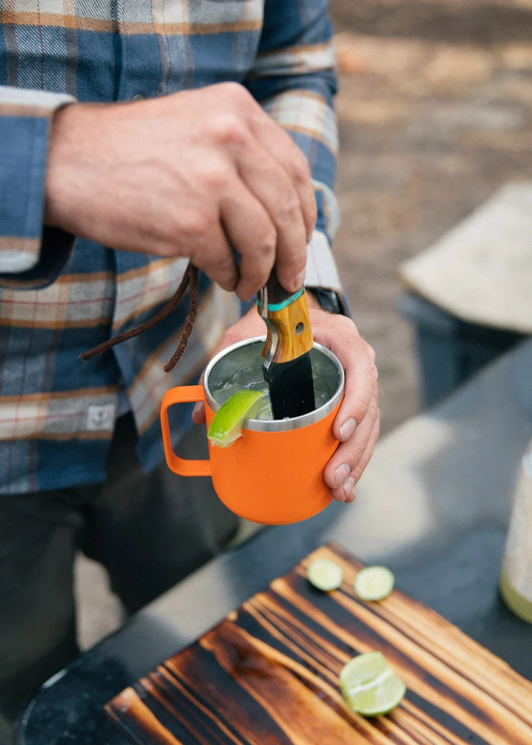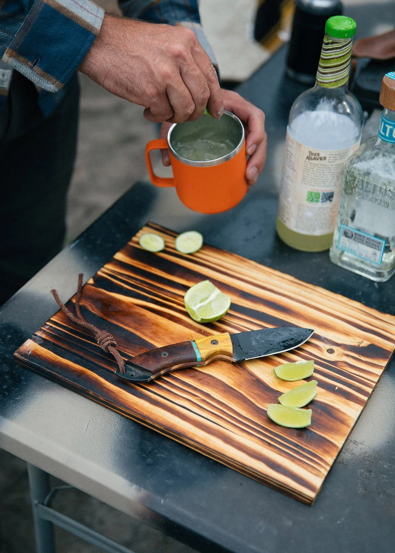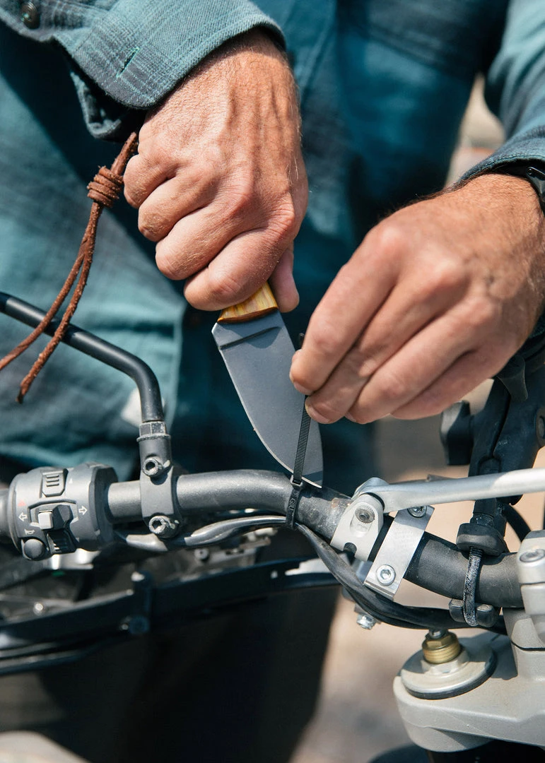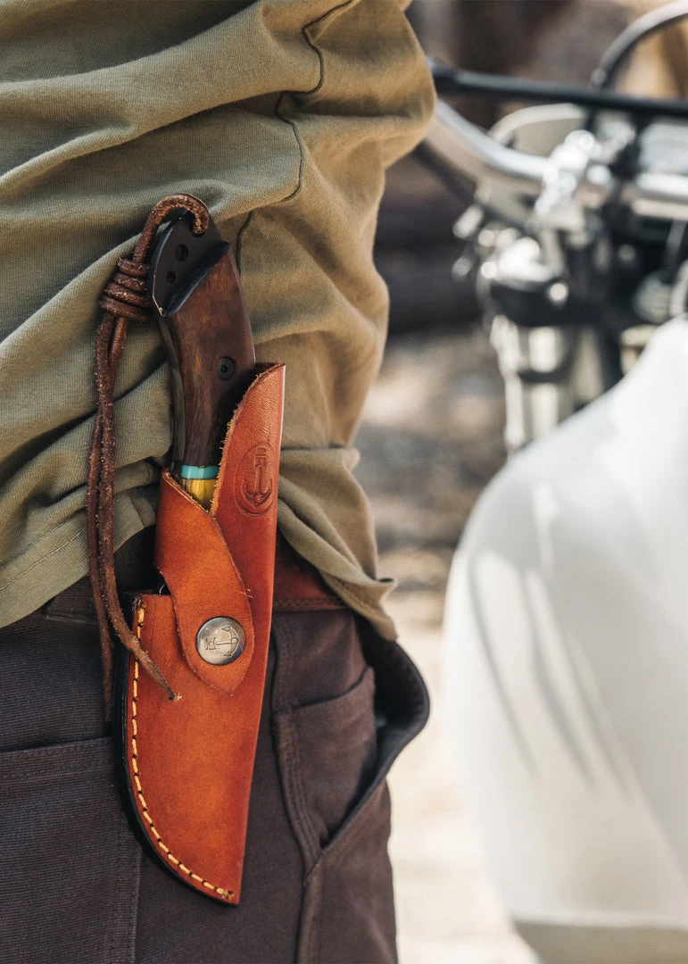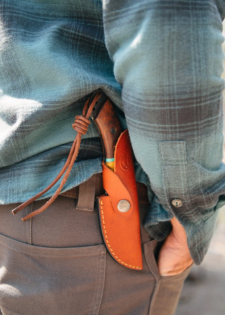 From hunting small game to cooking Kielbasa at basecamp, the Iron & Resin Skinner Knife is ideal for everyday tasks whether you’re out in the backcountry or just a few minutes from the ol’ homestead. With a maple and rosewood handle on a D2 steel full-tang drop point blade, and a glass breaker at the butt-end, this knife is just as beautiful as it is effective. This knife comes standard with a handmade leather sheath that easily attaches to the belt.