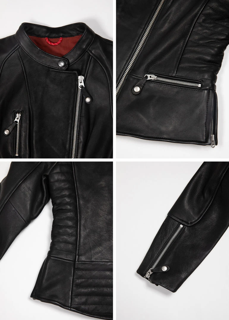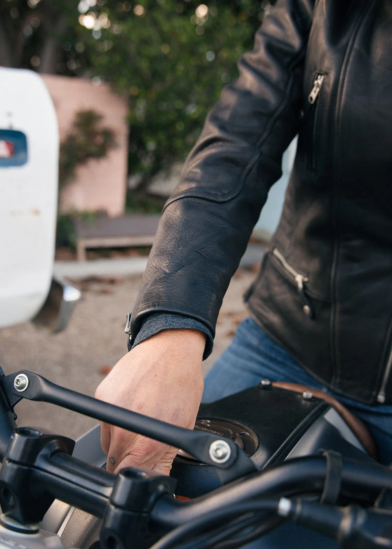 The Trinity Jacket provides a serious motorcycle jacket for women. Built from a 1.1mm semi veg tanned steer-hide, it has been oiled and tumbled to provide it with that already broken in feel (something you’d expect in a high quality leather jacket). A number of other details come standard with the Trinity Jacket as well: CE armor compatible at the spine, shoulders, and elbows; Talon® zippers throughout, a refined female-centric fit, and the sleek looks of a motorcycle jacket.