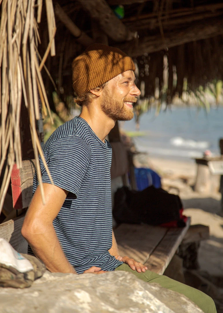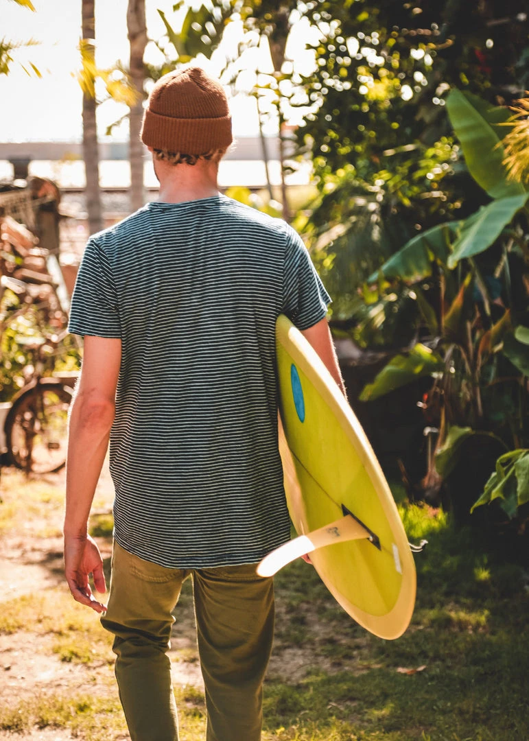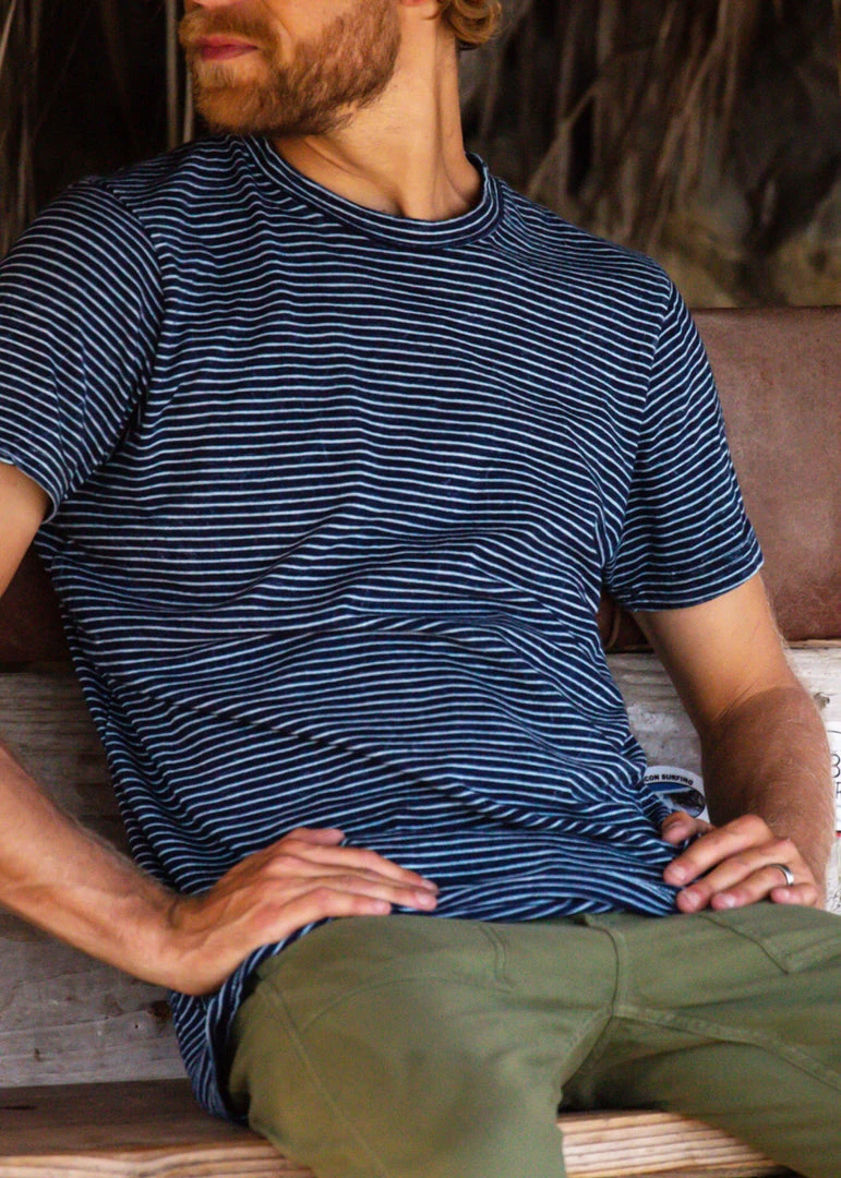 The Iron & Resin True Blue Indigo Stripe Tee is a men’s basic tee that comes with a timeless, nostalgic, look. Made with 20 Singles 100% Cotton, this tee will provide a bit more weight to your wardrobe for the cooler months, but will be soft enough to consider sleeping in. Made in the USA with an organic dyeing process that’s been around for ages, these unique tees are made with a natural, plant-based, True Blue Indigo Dye. The mineral wash on the Dark Indigo, and the potassium wash on the Light Indigo, gives this shirt an already worn in feel, plus a vintage weathered look.Â