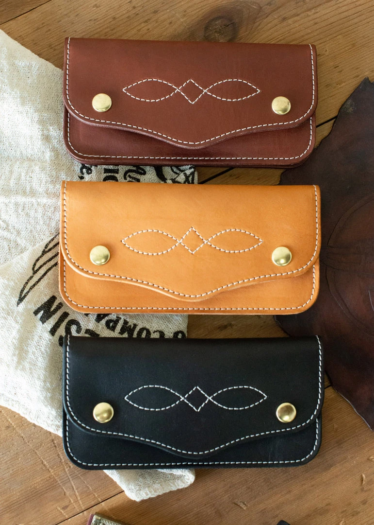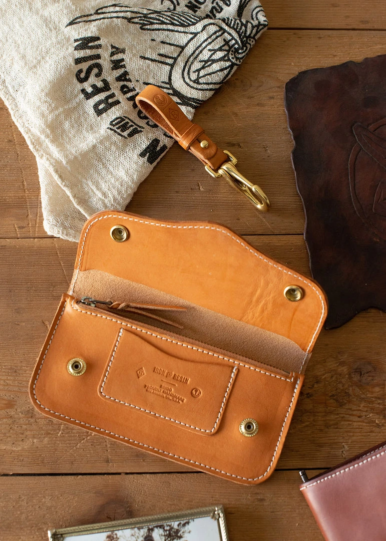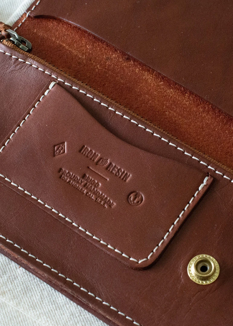 Our Brigg Leather Supply x Iron & Resin Roper Wallet is built for a lifetime of use. Made with a snap closure, a card slot, and a large zip pouch this wallet is ready for it all. Featuring a western inspired pattern and contrast stitching, this is a wallet that’s not only functional but looks good doing it.