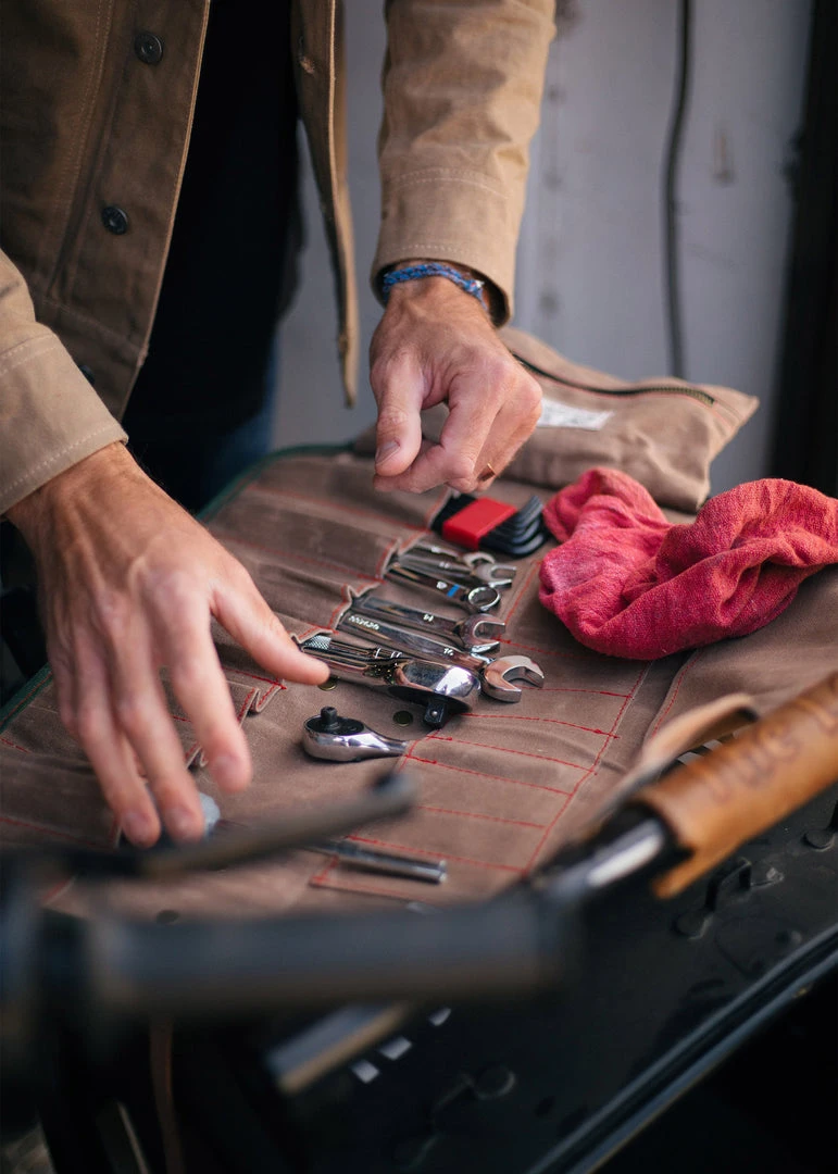 Made from the perfect combination of rugged materials – 1.2-1.3mm buffalo hide on the outside and 10oz waxed cotton canvas on the inside – this is the perfect on-the-road addition for any rig.Â