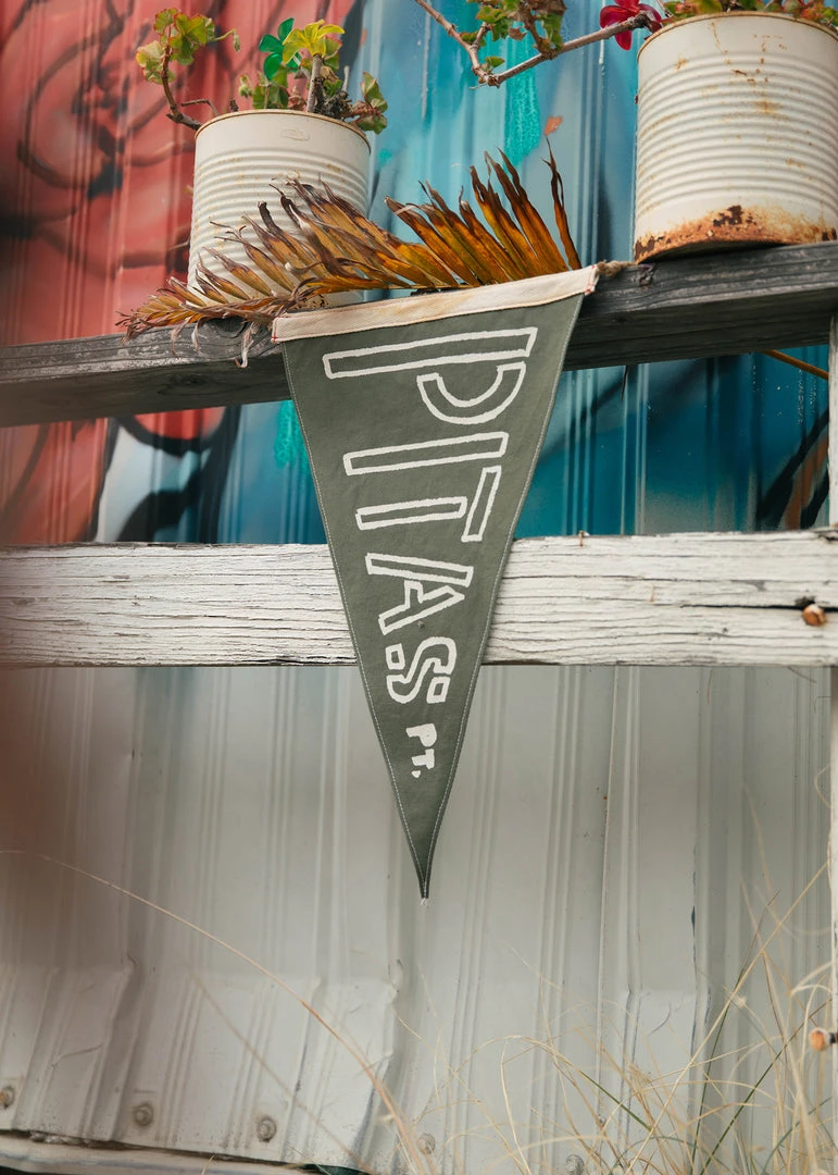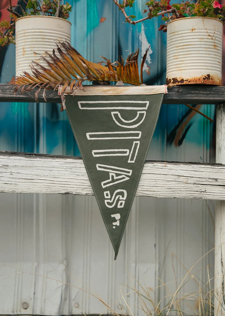- Washed green canvas with hand-stenciled painted Pits PT. print