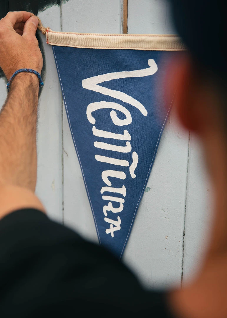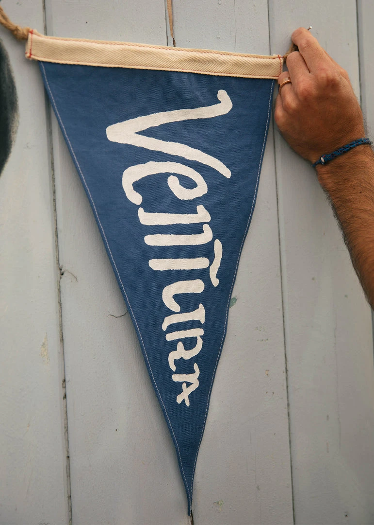 - Washed navy blue canvas with hand-stenciled painted Ventura print